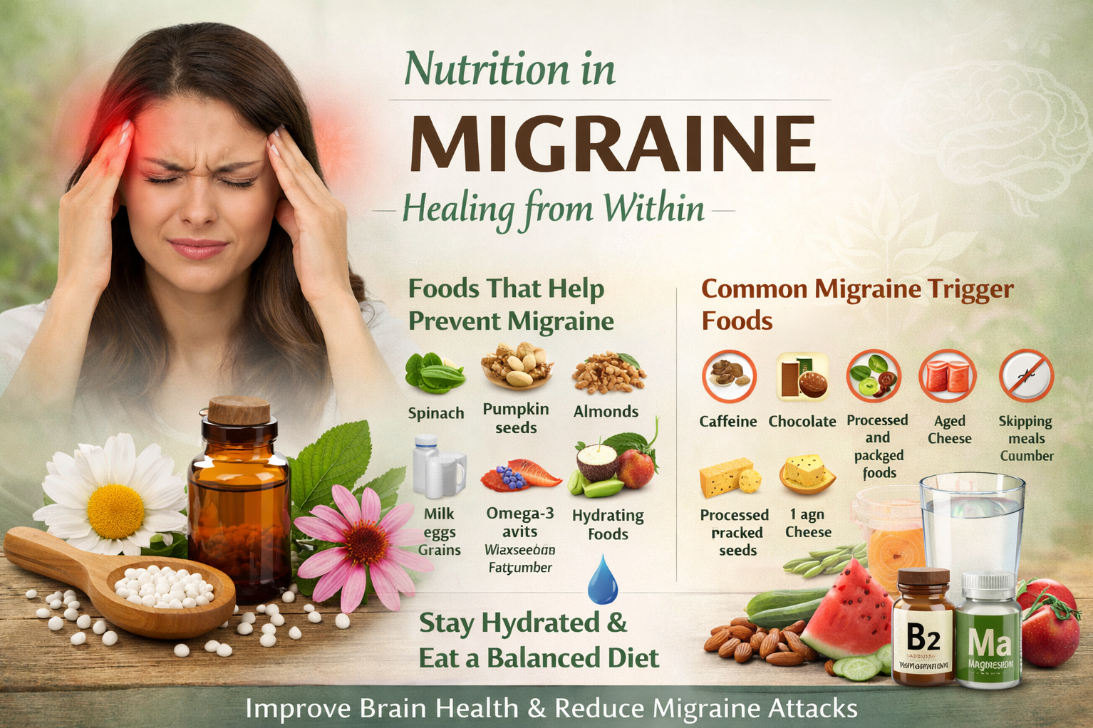 Best Dietitian for Migraine in Rabale. 🥗 Nutrition in Migraine: Healing from Within Migraine is not just a neurological condition—it is often closely linked to dietary habits and nutritional deficiencies. While medications provide temporary relief, the right nutrition can play a powerful role in reducing the frequency, intensity, and duration of migraine attacks. 🌿 How Nutrition Impacts Migraine Certain foods can act as triggers, while others support brain health and help prevent migraines. Imbalances in nutrients like magnesium, riboflavin (Vitamin B2), and omega-3 fatty acids are commonly associated with migraines. 🍎 Foods That Help Prevent Migraine Including the right foods in your daily diet can make a significant difference: Magnesium-rich foods: Spinach, pumpkin seeds, almonds Riboflavin sources: Milk, eggs, whole grains Omega-3 fatty acids: Walnuts, flaxseeds, fatty fish Hydrating foods: Coconut water, fruits like watermelon and cucumber These nutrients help in relaxing blood vessels, reducing inflammation, and improving brain function. ⚠️ Common Migraine Trigger Foods Identifying and avoiding trigger foods is equally important: Caffeine (excess tea/coffee) Chocolate Processed and packaged foods Aged cheese Skipping meals or fasting Note: Triggers may vary from person to person. 💧 Hydration: The Forgotten Key Dehydration is one of the most common yet overlooked causes of migraine. Ensure you consume adequate water throughout the day to prevent headaches. 🌸 Practical Dietary Tips Eat meals at regular intervals Avoid long gaps between meals Maintain a food diary to track triggers Prefer fresh, home-cooked meals over processed foods 🌿 A Holistic Approach to Migraine Nutrition, when combined with proper lifestyle and personalized care, can significantly improve migraine management. A balanced diet not only reduces migraine episodes but also enhances overall health and well-being.