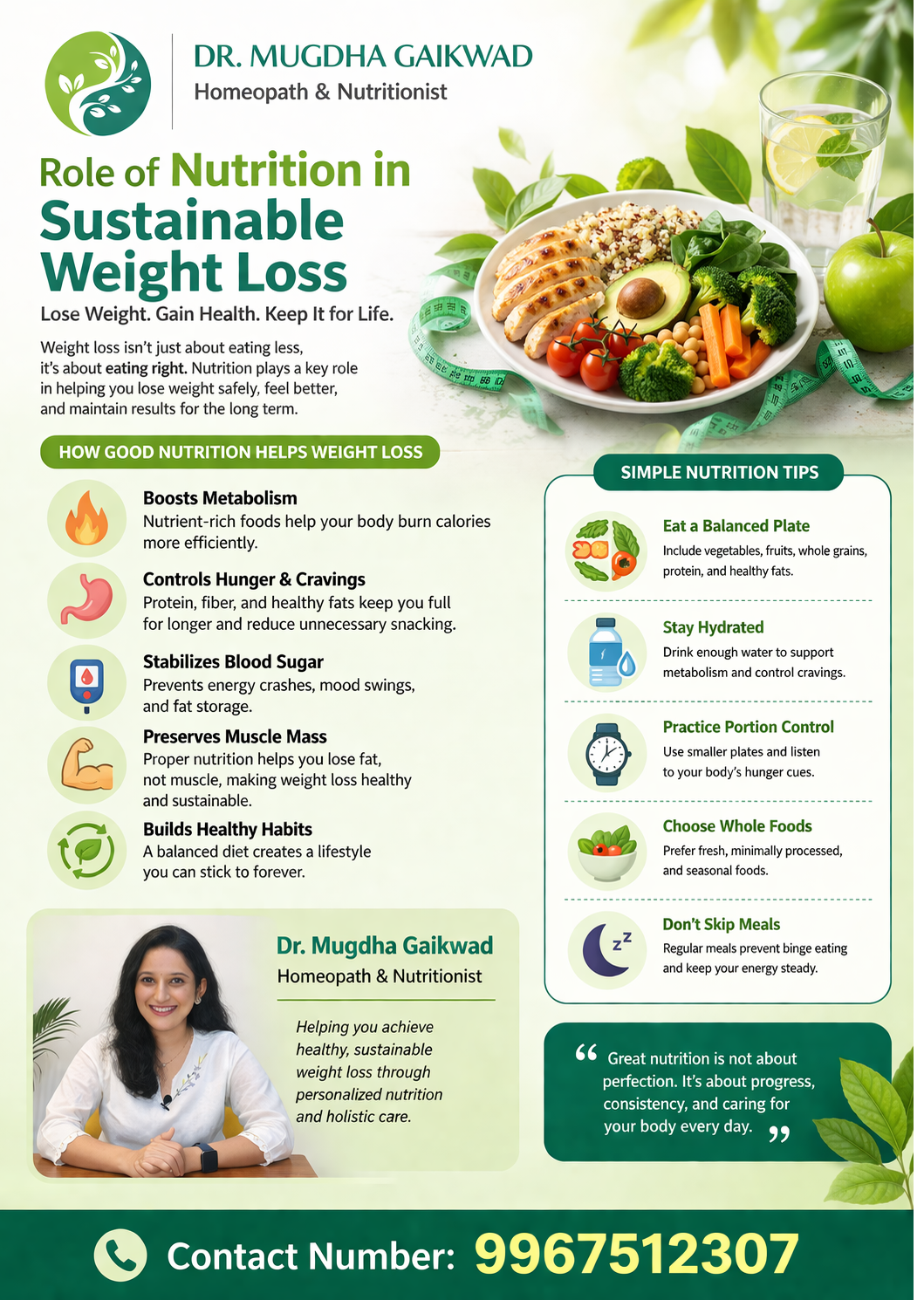 Best Nutritionist for Sustainable weight loss in Mulund Role of Nutrition in Sustainable Weight Loss Sustainable weight loss begins with the right nutrition—not extreme dieting or temporary restrictions. The food you consume directly impacts your metabolism, energy levels, and the body’s ability to burn fat efficiently. A balanced diet that includes **proteins, carbohydrates, and healthy fats** is essential for long-term results. Protein helps preserve lean muscle mass and promotes satiety, reducing unnecessary cravings. Healthy fats support hormonal balance, while complex carbohydrates provide sustained energy and prevent sudden hunger spikes. In addition, **vitamins and minerals** play a crucial role in regulating metabolic functions. Nutritional deficiencies can slow down weight loss and lead to fatigue, making it harder to stay consistent. Proper hydration further supports digestion, improves metabolism, and helps control appetite. Sustainable weight loss is not about starving the body but about practicing **portion control, regular meal timing, and mindful eating**. Irregular eating patterns and extreme calorie restrictions often result in temporary results followed by weight regain. A nutrition-focused approach ensures gradual fat loss while maintaining overall health and well-being. It helps improve digestion, stabilize energy levels, and build habits that are easy to follow in the long term. At the core, successful weight loss is a lifestyle change. With the right nutritional guidance, it is possible to achieve and maintain a healthy weight without compromising your health. **Choose nourishment over restriction—and let your results last for life.**