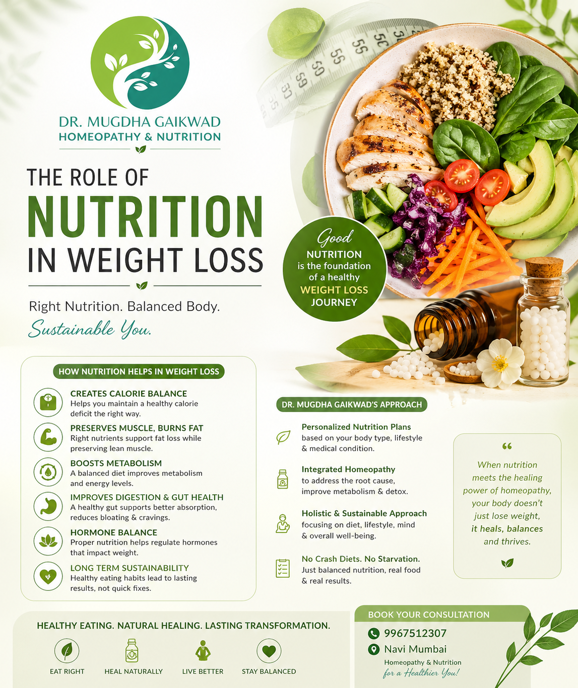 Best Nutritionist For weight loss in Airoli Role of Nutrition in Weight Loss By Dr. Mugdha Gaikwad | Homeopathy | Nutrition | Family Physician When it comes to weight loss, most people focus only on exercise—but the truth is, **nutrition plays the most crucial role**. What you eat, how you eat, and when you eat directly influence your metabolism, hormones, and overall ability to lose weight effectively. Weight loss is not about eating less—it’s about **eating right**. Why Nutrition Matters in Weight Loss Your body needs the right balance of nutrients to function efficiently. Poor eating habits can slow down metabolism, increase fat storage, and lead to nutritional deficiencies. A well-planned diet helps in: ✔ Improving metabolism ✔ Reducing unhealthy cravings ✔ Maintaining muscle mass ✔ Balancing hormones ✔ Supporting fat loss instead of muscle loss Calorie Deficit – But Done Right Yes, weight loss requires a calorie deficit—but extreme dieting can do more harm than good. A balanced nutritional approach ensures: * You lose fat, not muscle * You stay energetic throughout the day * You avoid rebound weight gain Importance of Macronutrients 1. Proteins** Help in muscle preservation and keep you full for longer, reducing unnecessary snacking. 2. Carbohydrates** Provide energy. Choosing the right carbs (whole grains, fruits) prevents sudden sugar spikes. 3. Healthy Fats** Essential for hormone balance and satiety. Avoiding fats completely can hinder weight loss. Micronutrients & Gut Health Vitamins and minerals are often overlooked but play a vital role in metabolism and fat burning. A healthy gut improves digestion, nutrient absorption, and even impacts weight regulation. Eating Habits Matter Weight loss is not just about food—it’s also about behavior. Healthy habits include: ✔ Mindful eating ✔ Regular meal timings ✔ Proper hydration ✔ Avoiding emotional eating ✔ Adequate sleep Sustainable Weight Loss is the Goal Crash diets may give quick results, but they are not sustainable. Proper nutrition ensures: ✔ Long-term weight maintenance ✔ Better energy levels ✔ Improved overall health Expert Guidance Makes the Difference Every individual’s body is different. A personalized nutrition plan helps address: * Lifestyle * Medical conditions * Food preferences * Metabolic variations Start Your Healthy Weight Loss Journey With the right nutritional guidance, weight loss becomes simpler, healthier, and sustainable. 📍 **Location:** Navi Mumbai 📞 **Contact:** 9967512307 **Dr. Mugdha Gaikwad** offers a holistic approach combining nutrition, lifestyle modification, and homeopathy to help you achieve lasting results.
