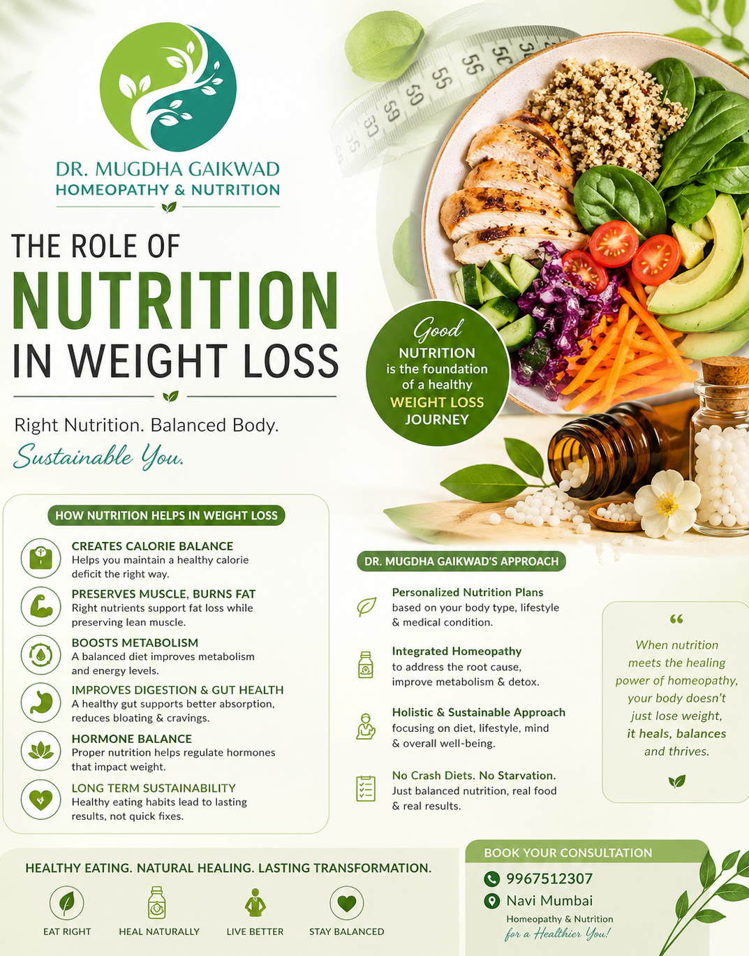 Best Nutritionist for weight loss in Navi Mumbai . Role of Nutrition in Weight Loss By Dr. Mugdha Gaikwad | Homeopathy | Nutrition | Family Physician When it comes to weight loss, most people focus only on exercise—but the truth is, nutrition plays the most crucial role. What you eat, how you eat, and when you eat directly influence your metabolism, hormones, and overall ability to lose weight effectively. Weight loss is not about eating less—it’s about eating right. ⸻ Why Nutrition Matters in Weight Loss Your body needs the right balance of nutrients to function efficiently. Poor eating habits can slow down metabolism, increase fat storage, and lead to nutritional deficiencies. A well-planned diet helps in: ✔ Improving metabolism ✔ Reducing unhealthy cravings ✔ Maintaining muscle mass ✔ Balancing hormones ✔ Supporting fat loss instead of muscle loss ⸻ Calorie Deficit – But Done Right Yes, weight loss requires a calorie deficit—but extreme dieting can do more harm than good. A balanced nutritional approach ensures: • You lose fat, not muscle • You stay energetic throughout the day • You avoid rebound weight gain ⸻ Importance of Macronutrients 1. Proteins Help in muscle preservation and keep you full for longer, reducing unnecessary snacking. 2. Carbohydrates Provide energy. Choosing the right carbs (whole grains, fruits) prevents sudden sugar spikes. 3. Healthy Fats Essential for hormone balance and satiety. Avoiding fats completely can hinder weight loss. ⸻ Micronutrients & Gut Health Vitamins and minerals are often overlooked but play a vital role in metabolism and fat burning. A healthy gut improves digestion, nutrient absorption, and even impacts weight regulation. ⸻ Eating Habits Matter Weight loss is not just about food—it’s also about behavior. Healthy habits include: ✔ Mindful eating ✔ Regular meal timings ✔ Proper hydration ✔ Avoiding emotional eating ✔ Adequate sleep ⸻ Sustainable Weight Loss is the Goal Crash diets may give quick results, but they are not sustainable. Proper nutrition ensures: ✔ Long-term weight maintenance ✔ Better energy levels ✔ Improved overall health ⸻ Expert Guidance Makes the Difference Every individual’s body is different. A personalized nutrition plan helps address: • Lifestyle • Medical conditions • Food preferences • Metabolic variations Start Your Healthy Weight Loss Journey With the right nutritional guidance, weight loss becomes simpler, healthier, and sustainable. 📍 Location: Navi Mumbai 📞 Contact: 9967512307